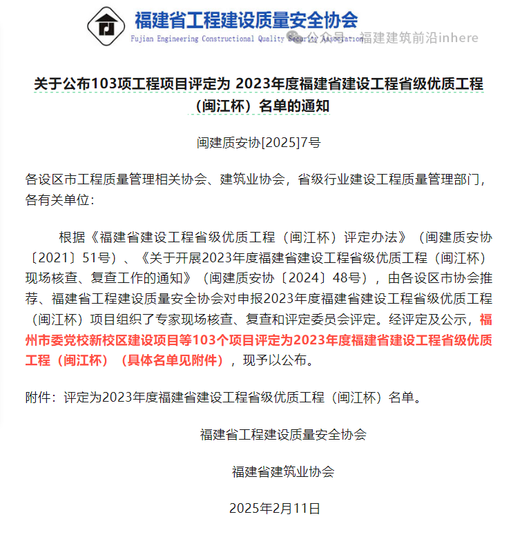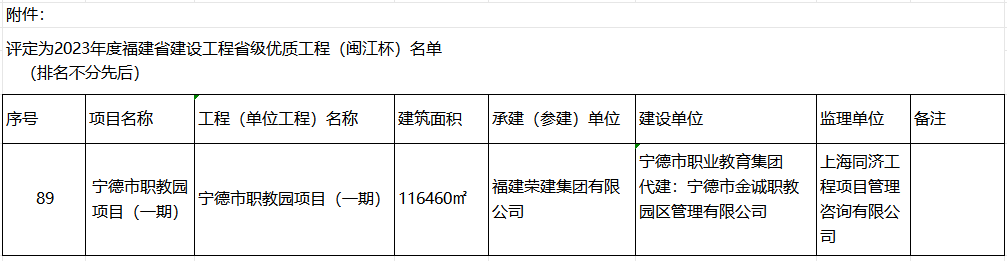 近日,福建省工程建设质量安全协会公布2023年度福建省建设工程省级优质工程(闽江杯)获奖名单,由988Pay 下属企业宁德市金诚职教园区管理有限公司(以下简称“金诚公司”)代建的“宁德市职教园项目(一期)”被评定为2023年度福建省建设工程省级优质工程(闽江杯)。